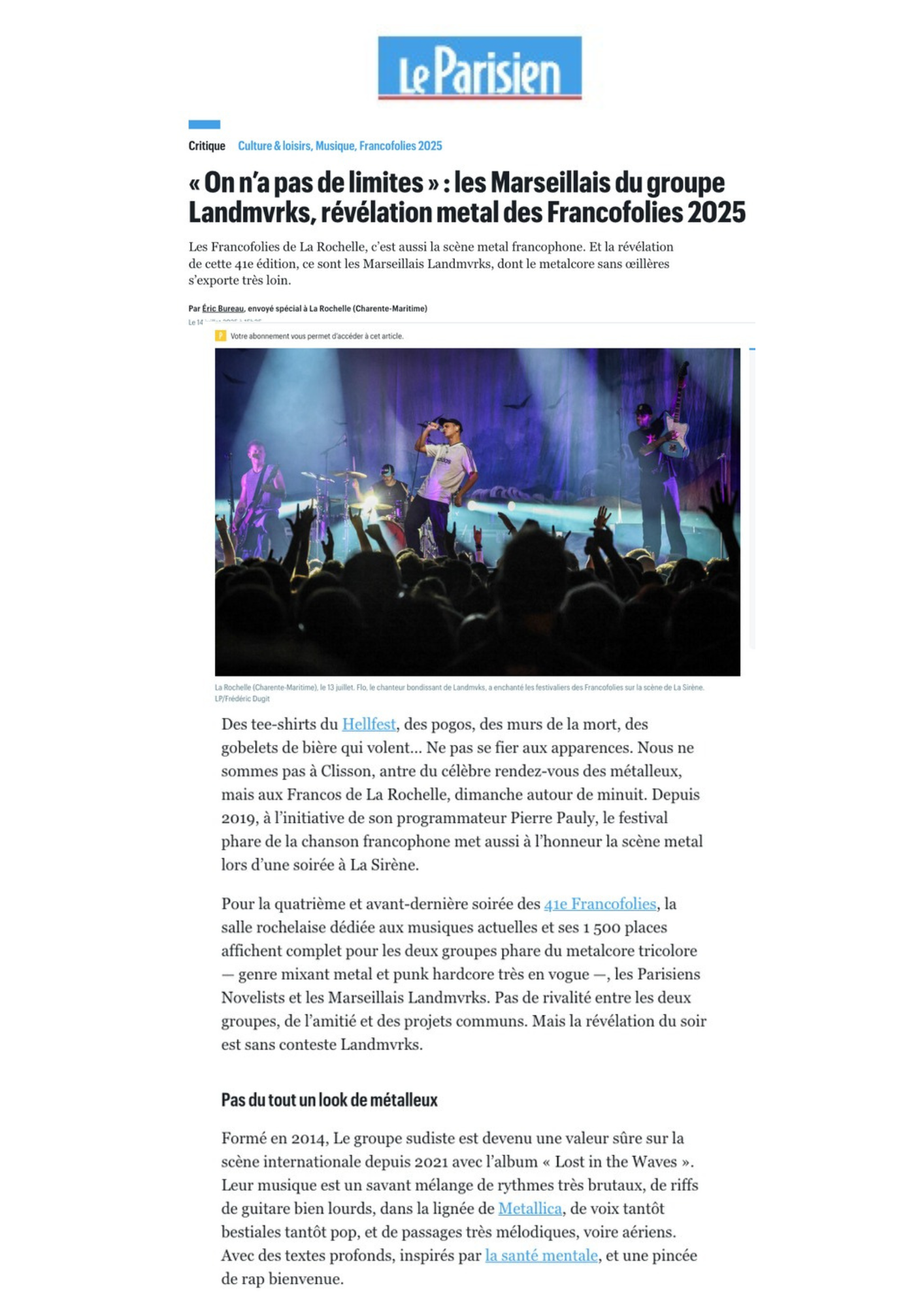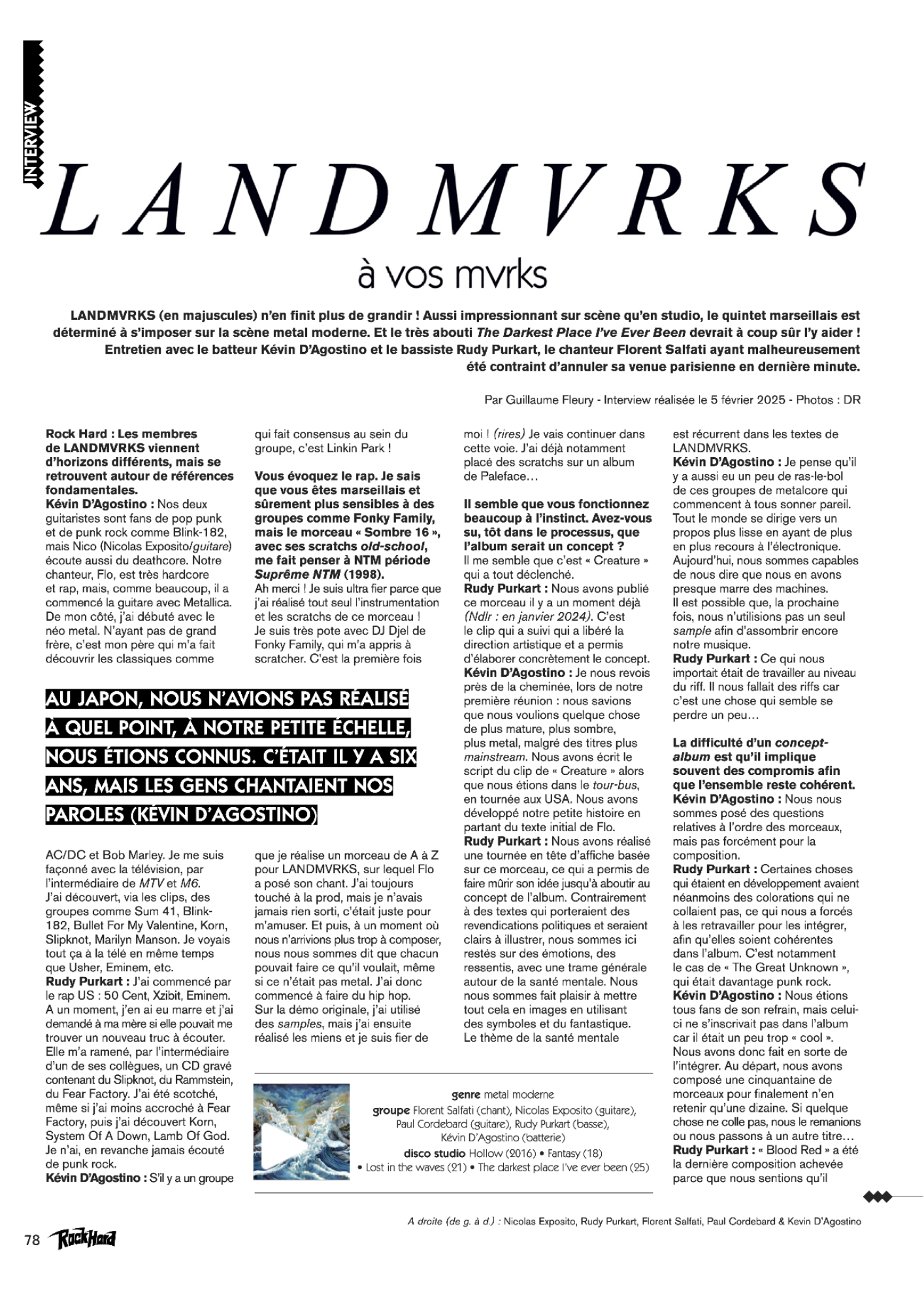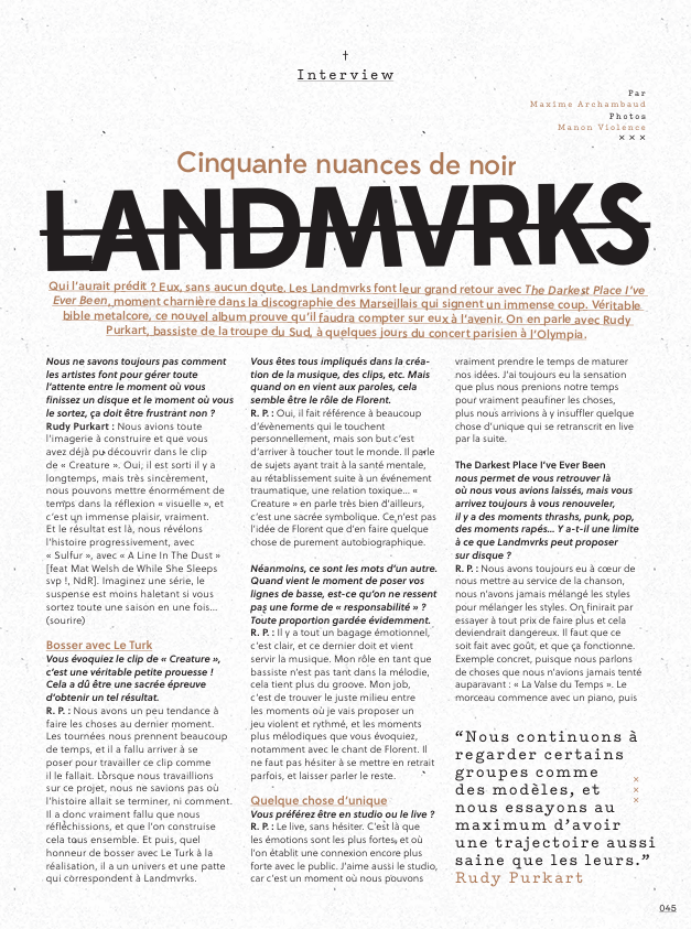 Avec The Darkest Place I’ve Ever Been, quatrième album de Landmvrks sorti le 25 avril 2025 via Arising Empire, Singularités a eu le plaisir de développer et concrétiser l’intérêt de médias de plus en plus diversifiés sur le territoire français. Une sortie qui souligne l’attention croissante des médias généralistes et confirme la place du groupe parmi les projets qui comptent.
