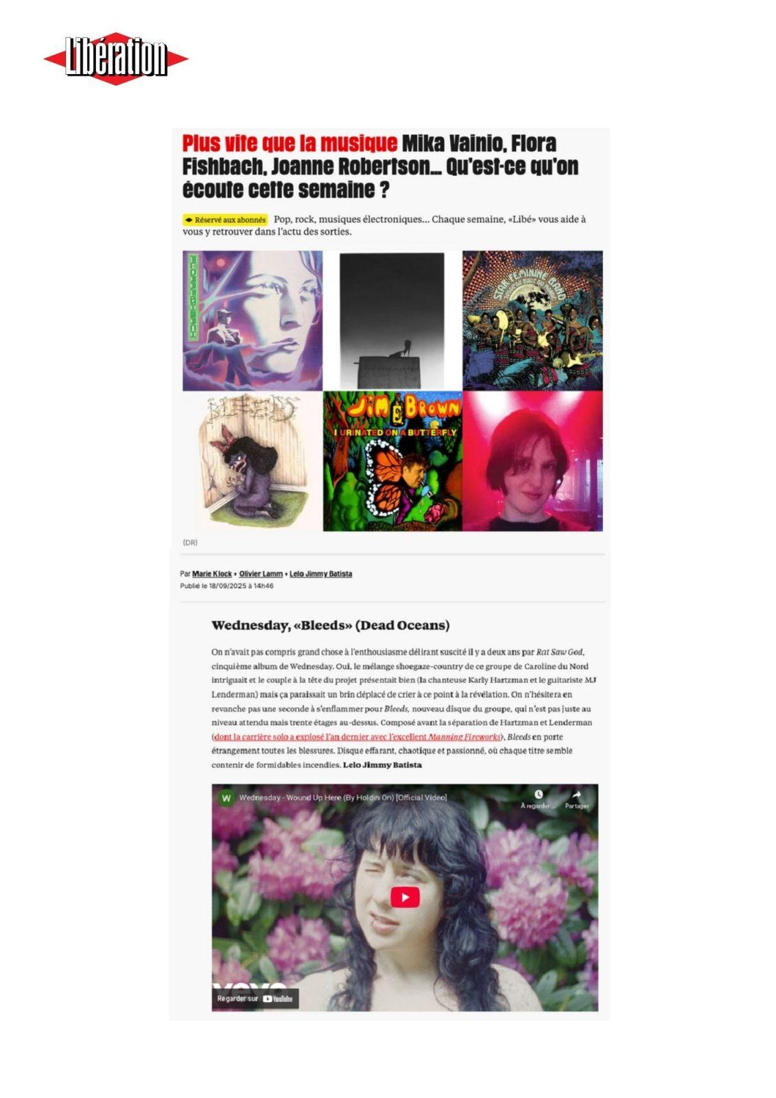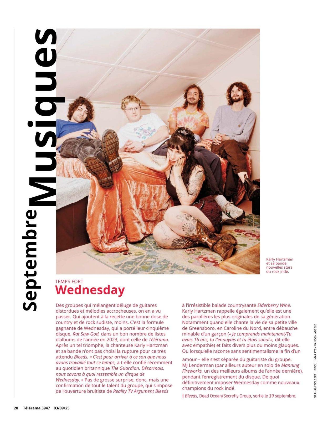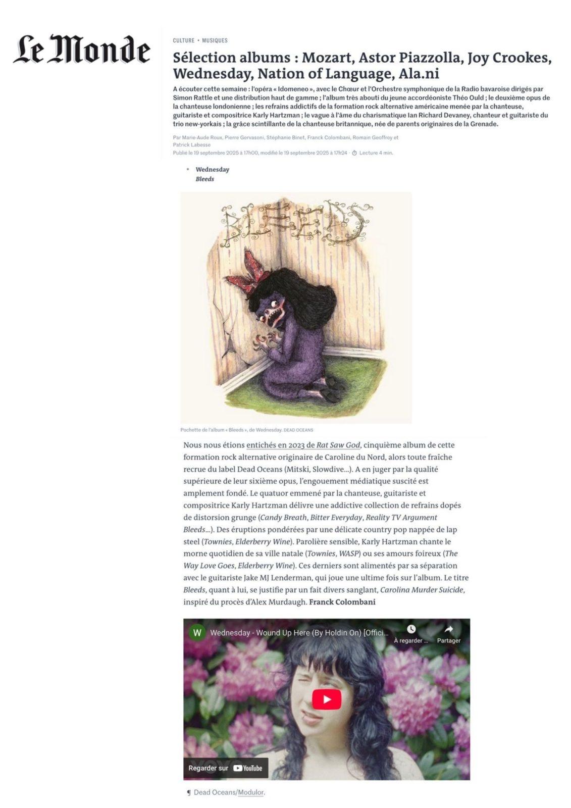 Originaires d’Asheville (Caroline du Nord), Wednesday mêle shoegaze, noise rock et country alternative en une formule unique portée par la plume acérée de Karly Hartzman sur la vie dans le Sud américain. Avec *Twin Plagues* (2021) puis l’acclamé *Rat Saw God* (2023), le groupe a redéfini un pan entier de l’indie rock, avant de confirmer leur trajectoire avec *Bleeds* en septembre 2025, accueilli par une critique unanimement enthousiaste. En France, le groupe s’impose progressivement comme une valeur sûre de la scène indie internationale, comme en témoigne leur passage au Trabendo en février 2026 devant un public conquis.